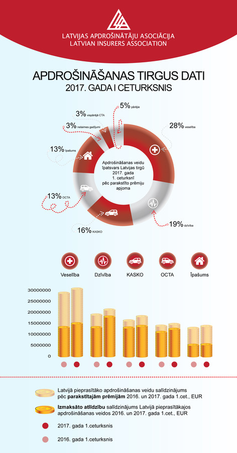 Šī gada pirmajā ceturksnī apdrošināšanas nozarē kopumā parakstīto prēmiju apjoms sastādījis 110,4 milj. eiro, kas ir par 8,1% vairāk nekā šajā laika posmā 2016. gadā. Klientiem atlīdzībās kopumā izmaksāti 70,9 miljoni eiro, kas ir par 16,1 % vairāk nekā 2016.gadā.