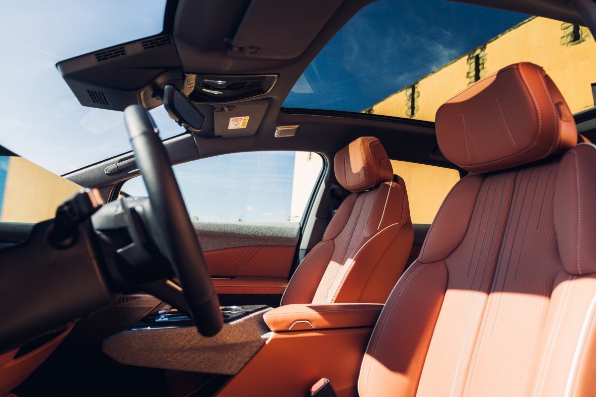 Interjers izceļas ar materiālu izvēli, kas apvieno ilgtspējību un greznību. Centrālā konsole ir veidota no “PaperWood” – unikāla tulpju koka un pārstrādāta avīžpapīra kompozīta, bet apdarei izmantots “Tide” – mīksts poliestera audums, kas izgatavots no 100% pārstrādāta materiāla. Šie elementi rada siltu, modernu atmosfēru, ko izceļ 33 collu izliekts LED displejs ar 9K izšķirtspēju, piedāvājot gan izcilu attēla kvalitāti, gan modernu digitālo pieredzi.