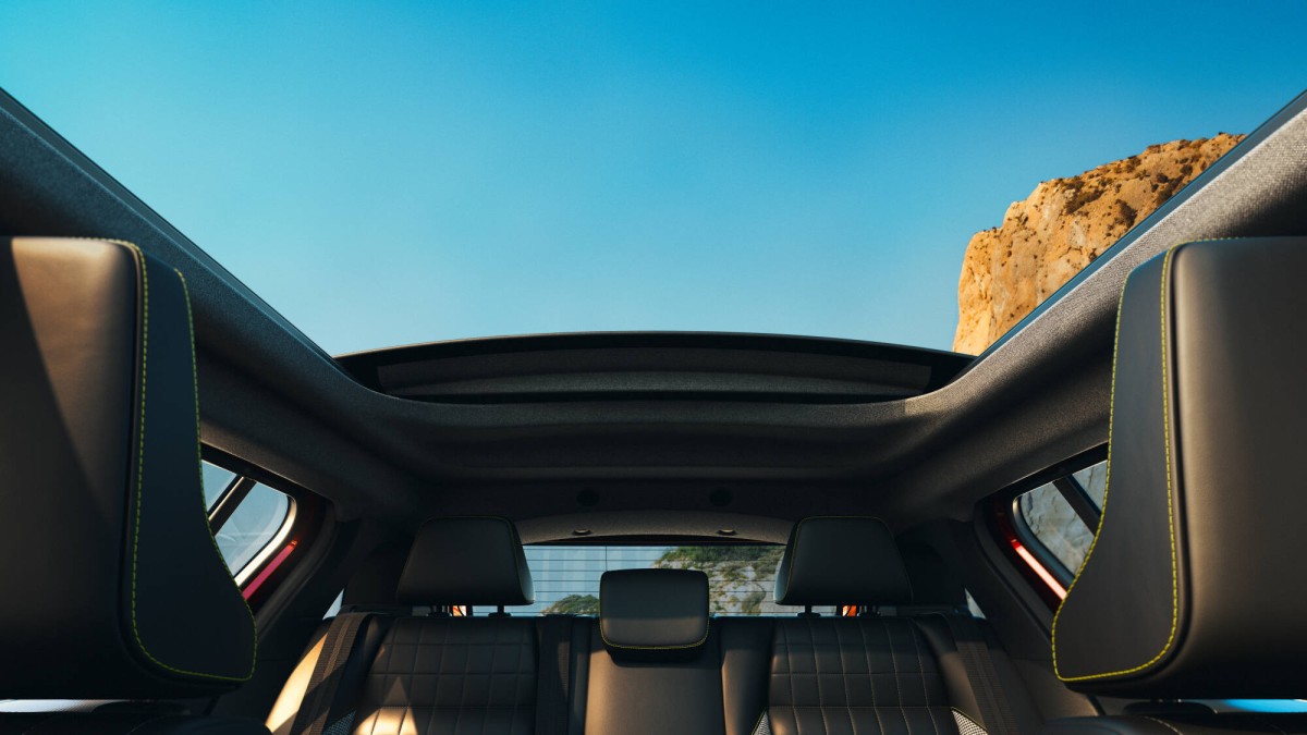 Melnais audekla jumts ir pārsteidzoša dizaina iezīme, kas piešķir Renault 4 E-Tech electric jaunu izskatu. Jumta stieņi ir noņemti, lai maksimāli palielinātu atvērumu, bet antena tagad ir integrēta aizmugurējā logā. Jau no paša sākuma transportlīdzeklis tika projektēts ar šādu jumtu, tāpēc tas būtiski neietekmē nevienu no tā galvenajām īpašībām. Piemēram, telpa galvai paliek praktiski nemainīga: 906 mm priekšpusē un 813 mm aizmugurē salīdzinājumā ar 886 mm un 853 mm versijā ar parasto jumtu.